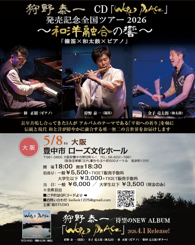 CD『WORLD PEACE』発売記念全国ツアー2026。篠笛奏者・狩野泰一、和太鼓奏者・金子竜太郎、ピアニスト・林正樹。三人が「平和への祈り」を軸に、深く響く音の世界を届けます。 - 出演 : 狩野泰一(篠笛)、金子竜太郎(和太鼓)、林正樹(ピアノ)