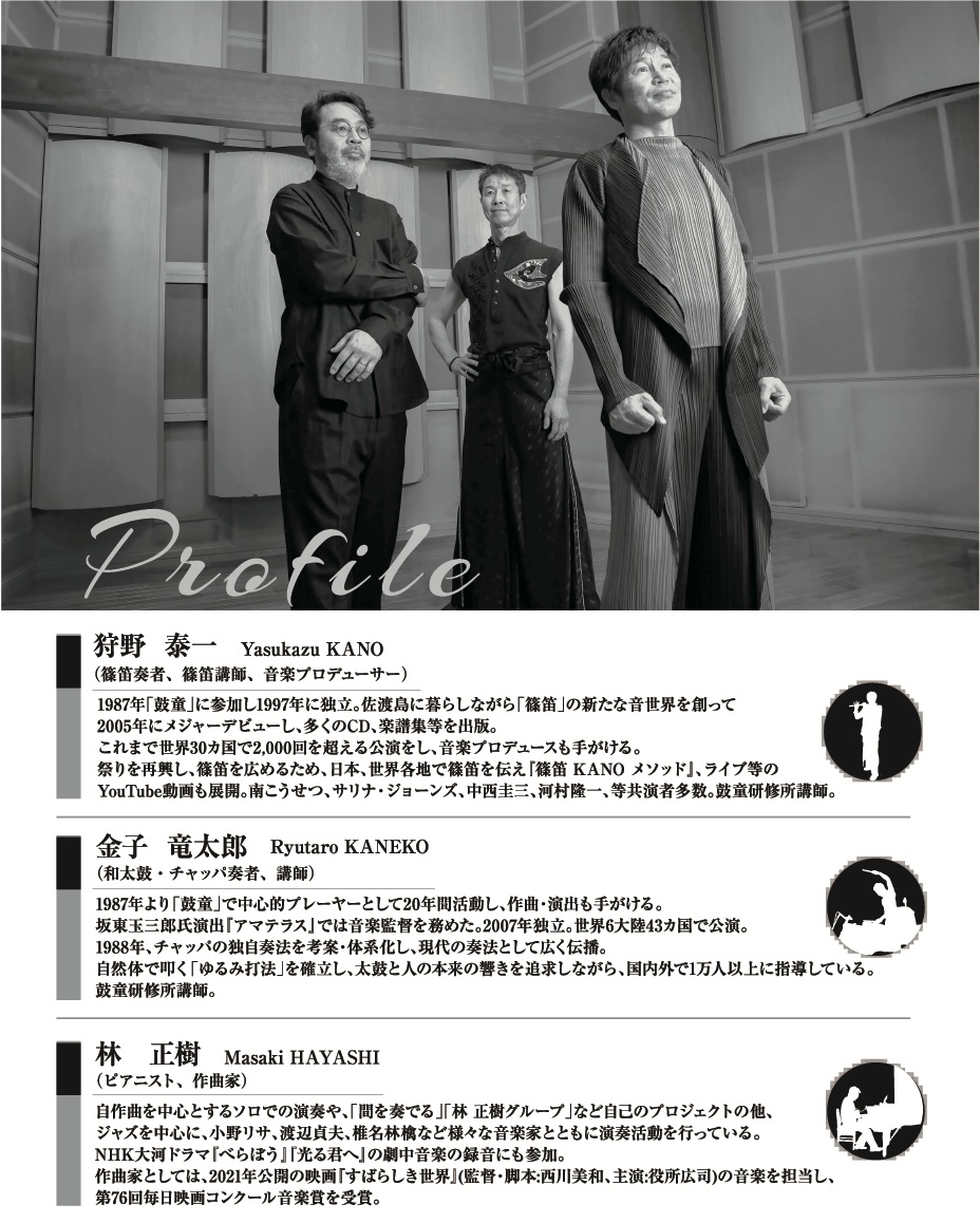 - 太鼓芸能集団鼓童で長年活躍してきた篠笛の狩野泰一と和太鼓の金子竜太郎が、斬新な笛太鼓の世界を作っています。そして、長年共演してきたピアノの天才、毎日映画コンクール音楽賞を受賞した林正樹が加わって、三人の新たな音世界は深まり、各地の大ホールで好評をいただいております。古今東西の音が絶妙な展開を見せるこの三人の達人ならではの和洋融合の響き、平和への祈りは、心地よい驚きとなる事でしょう。