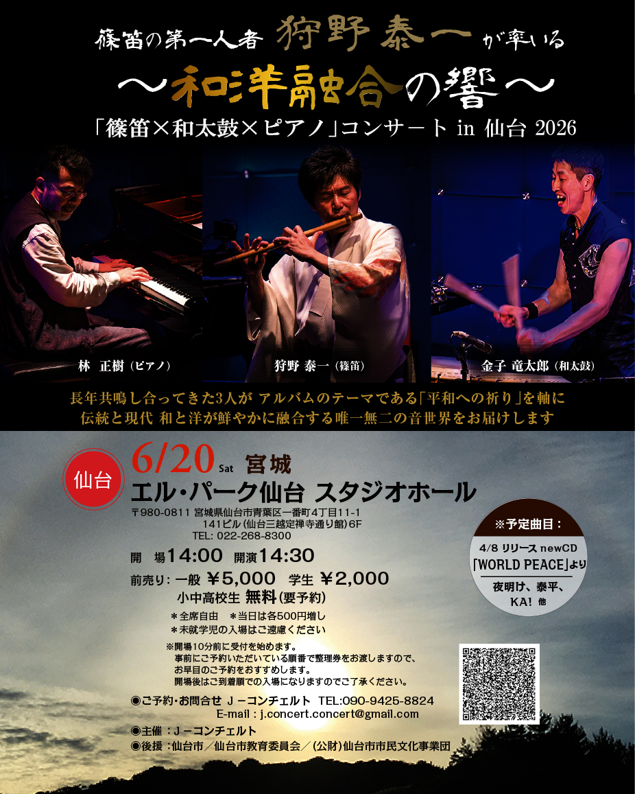 篠笛の第一人者 狩野泰一が率いる「篠笛×和太鼓×ピアノ」 ~和洋融合の響き~ in 仙台 2026