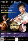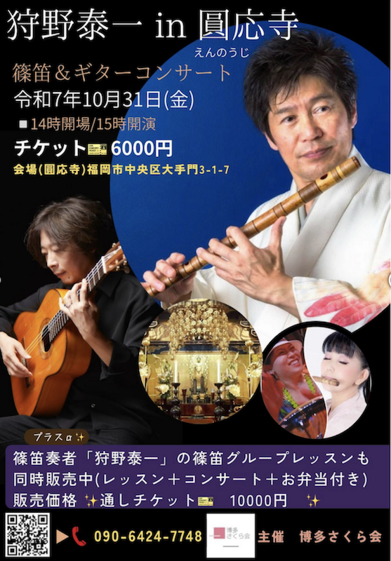 狩野泰一の篠笛演奏と、共演するギタリストの技巧が生み出す音楽 空間は、圓応寺の歴史ある佇まいとともに、特別な時間を創り出します。